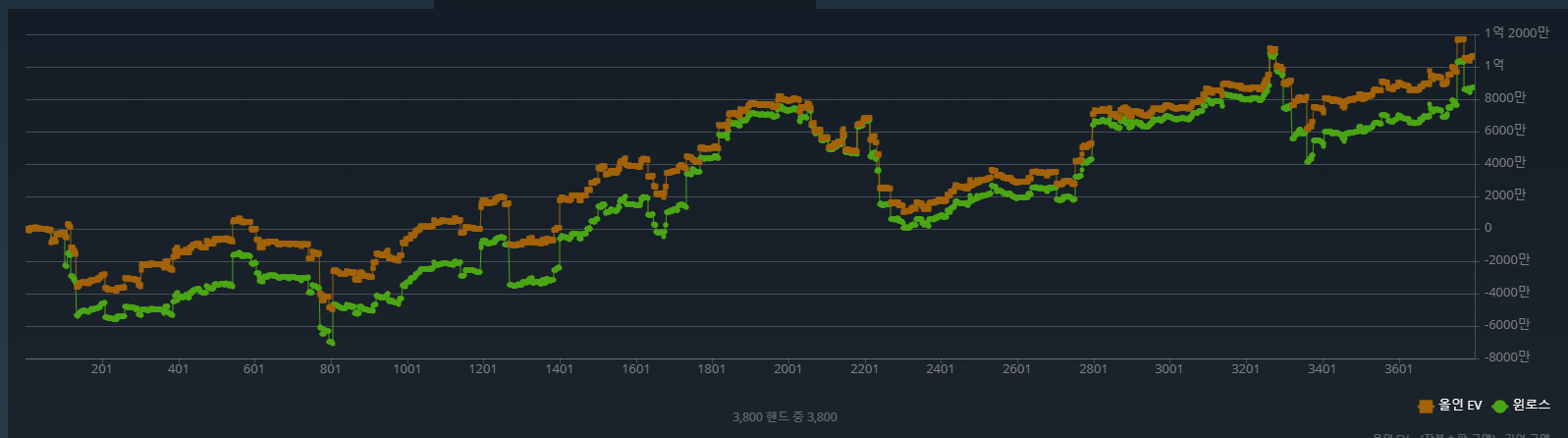 올인 EV(기댓값)과 윈로스(실제 위닝)이 200bb 벌어졌다. 전날과 비교하면 그다지 좋지는 않은 상황이다. 그새 자만을 했는지 오늘은 누가봐도 콜이 많았던 것 같은 날이다. 딱히 리뷰할 핸드는 없으므로 핸드리뷰는 생략하겠다.