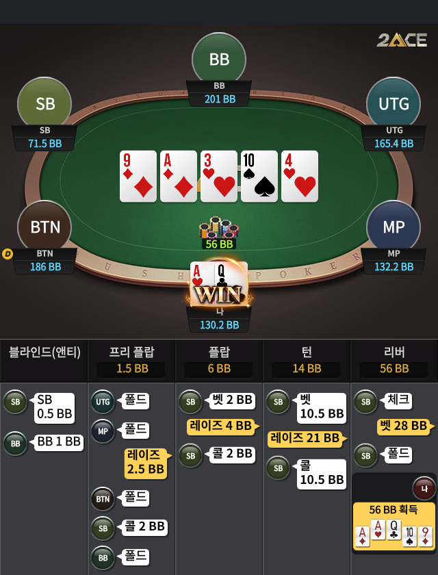 상대방이 투페어+ 일 수도 있지만, 말도 안되는 보드에서의 동크를 응징하기 위해 레이즈를 했다.